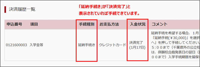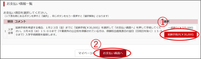 1月23日(金)までに下記リンク「入学金決済サイト」から「延納手続き(¥30,000)」ボタンを選んで入学手続延期の手続(延納手続)を行ってください(入学手続期限の延期を希望しない場合は不要)。合格を確認しただけでは入学手続の延期は完了していません。
