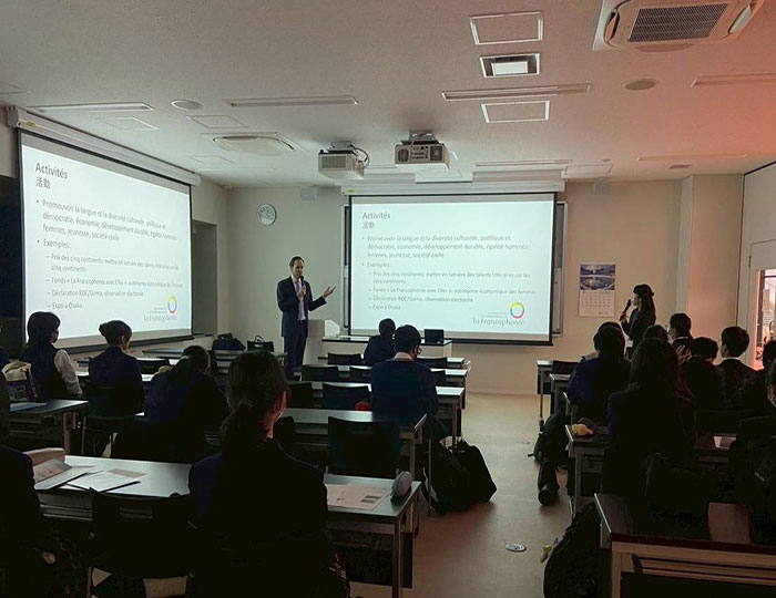 去る2月16日、ベルギー大使館公使参事官のエデュアルド・ヴァン・クルーネン(Eduard VAN KLEUNEN)氏を本校にお迎えし、フランス語を学んでいる生徒やベルギーに関心のある生徒を対象に、「フランコフォニーがあなたの学校へやってくる」(※「フランコフォニー」とは、フランス語を話す国や地域による共同体のこと)という題でご講演いただきました。