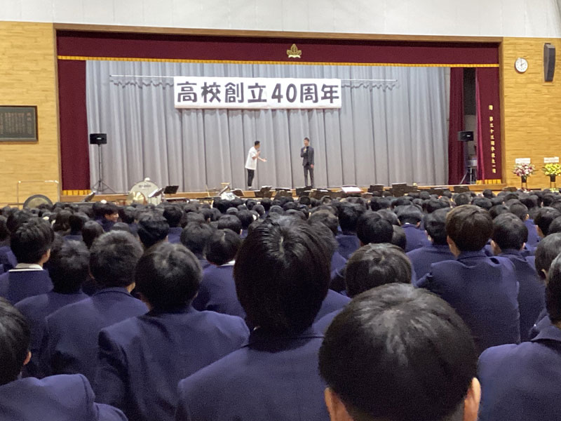 24日は生徒が第一体育館に一堂に会し、校長・生徒会長の力強いあいさつに続き、吹奏楽部の華麗な演奏、チアリーディング部のはつらつとしたパフォーマンスが披露され、会場は熱気に包まれました。お笑いコンビ「げんき〜ず」様による記念公演では、生徒の笑顔が溢れる時間となりました。