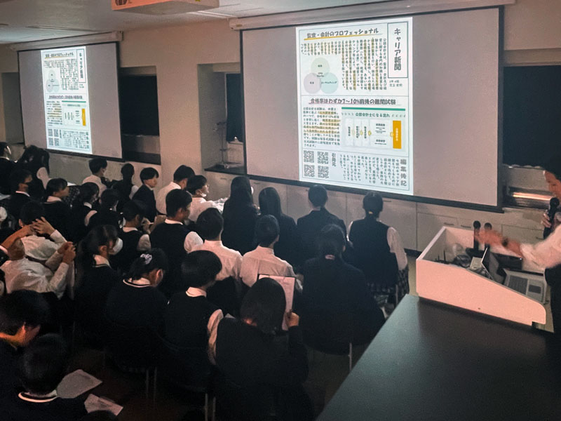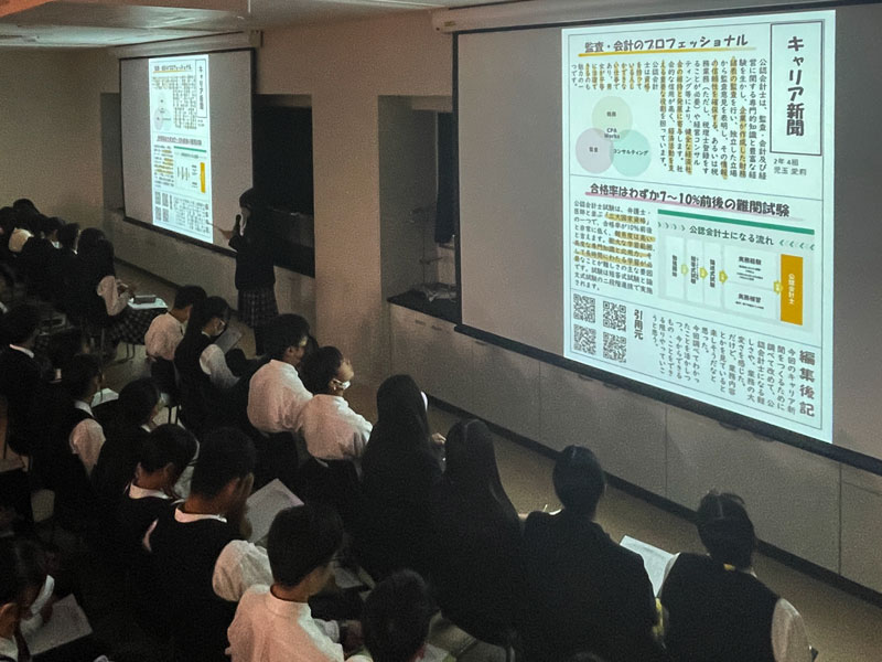 今回は、その中でも2年生が取り組んだ「キャリア新聞」発表会の様子をご紹介します。