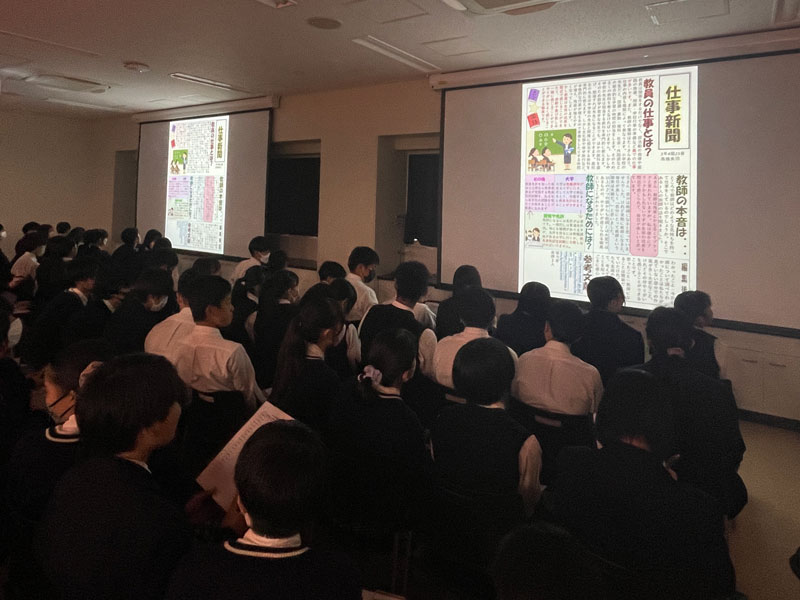 授業の後半では、自分が関心をもった仕事をテーマに新聞を作成しました。完成した新聞は、隣のクラスの仲間たちによって評価されました。後日、各クラスから選ばれた代表生徒20名が、理科多目的ホールでの全体発表会に臨みました。そこでは、次の3つの観点で評価を行ないました。