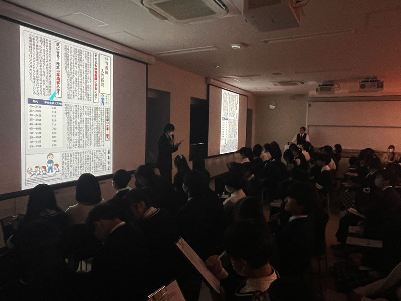 まずは担任の先生によるキャリア講話から始まり、保護者の皆様にもご協力をいただいて、さまざまな職業についての貴重なお話を伺いました。普段の生活の中ではなかなか触れることのない仕事の世界を知ることで、生徒たちは新たな興味や憧れを見つけていきます。