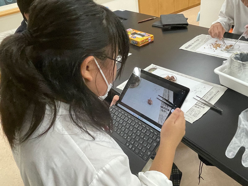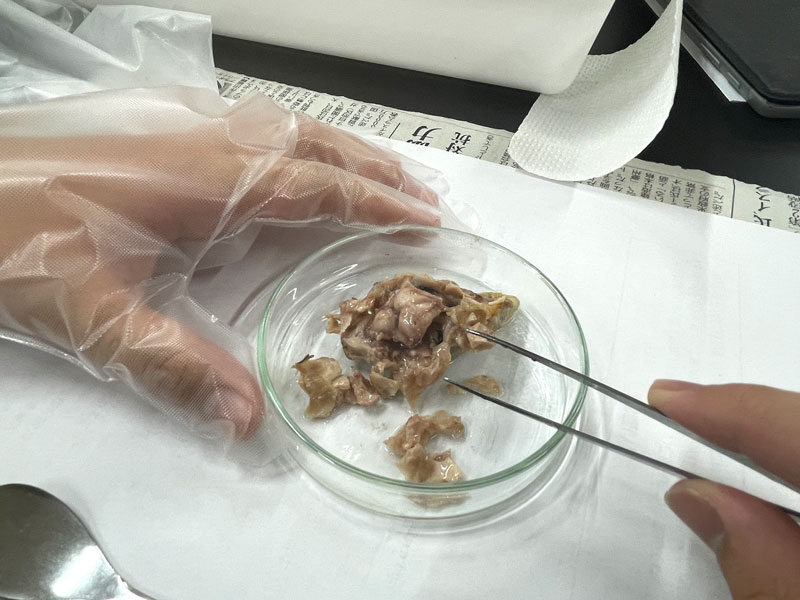 中学1年生では生物分野の学習を中心に行っており、今回はニワトリの脳の解剖実習を実施しました。独特なにおいに驚く生徒もいましたが、次第に真剣な表情で観察に取り組み、鳥類の脳の特徴を丁寧に探っていきます。鳥類は飛翔に特化しており、視覚情報を処理する能力が高いため、眼球と視神経の太さの比率が哺乳類とは大きく異なることに気づきます。さらに、大脳や小脳の構造の違いから、生物の進化や機能の多様性にも関心を広げていきました。