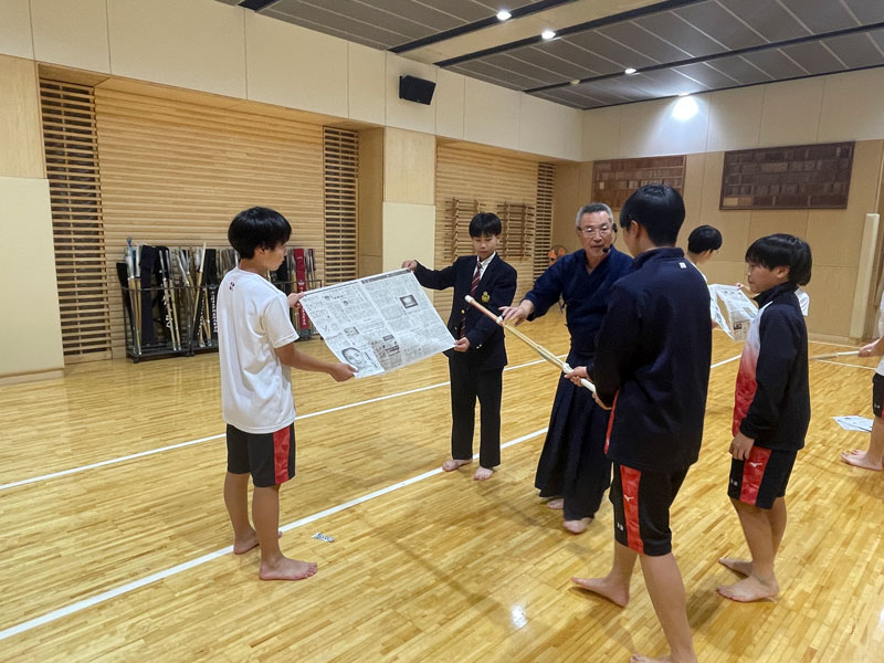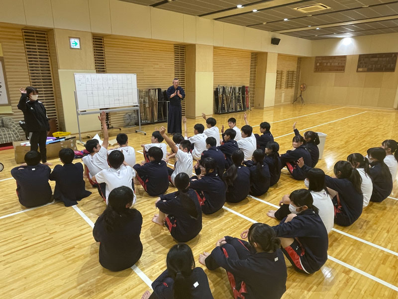 生徒たちは面をつける姿勢や礼の仕方など基礎を学びながら、剣道ならではの凛とした空気を感じつつ、笑顔で取り組んでいました。