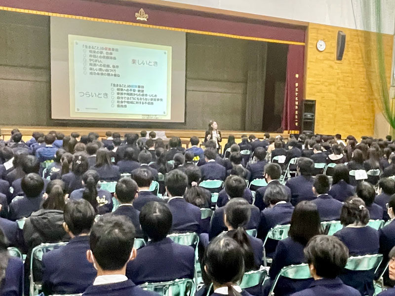 さらに講演は、単なる注意喚起にとどまらず、困ったときにSOSを出すことの大切さ、そして、一人で抱え込まないこと。何よりも、命の重さを大切にすること。といった、自殺予防にもつながる内容へと深められ、生徒たちは真剣な表情で耳を傾けていました。